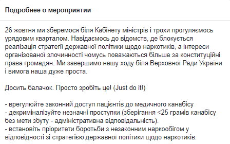 Участники марша соберутся 26 октября в 12:00 возле Кабинета министров. Они планируют пройти по правительственному кварталу и "отправиться к ведомству, где блокируется реализация стратегии государственной политики в отношении наркотиков". Завершится марш возле здания Верховной Рады Украины.