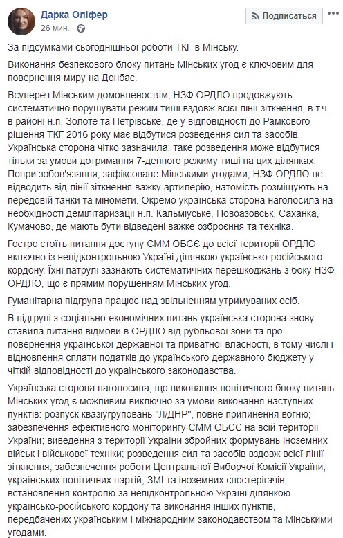 "Украинская сторона отметила, что выполнение политического блока вопросов Минских соглашений возможно исключительно при условии выполнения следующих пунктов: