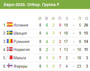 Таким образом сборная Испании набрала 20 очков в своей группе F и гарантировала себе путевку в финальную часть Евро-2020. Ранее на чемпионат Европы вышли Бельгия, Россия, Италия, Польша и Украина.