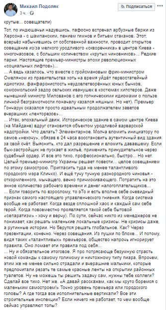 Он добавил, что "эпохальный движ" с историческим здание в самом центре Киева, которое стало объектом уродливой варварской надстройки, можно было решить за 24 часа без лишнего шума.