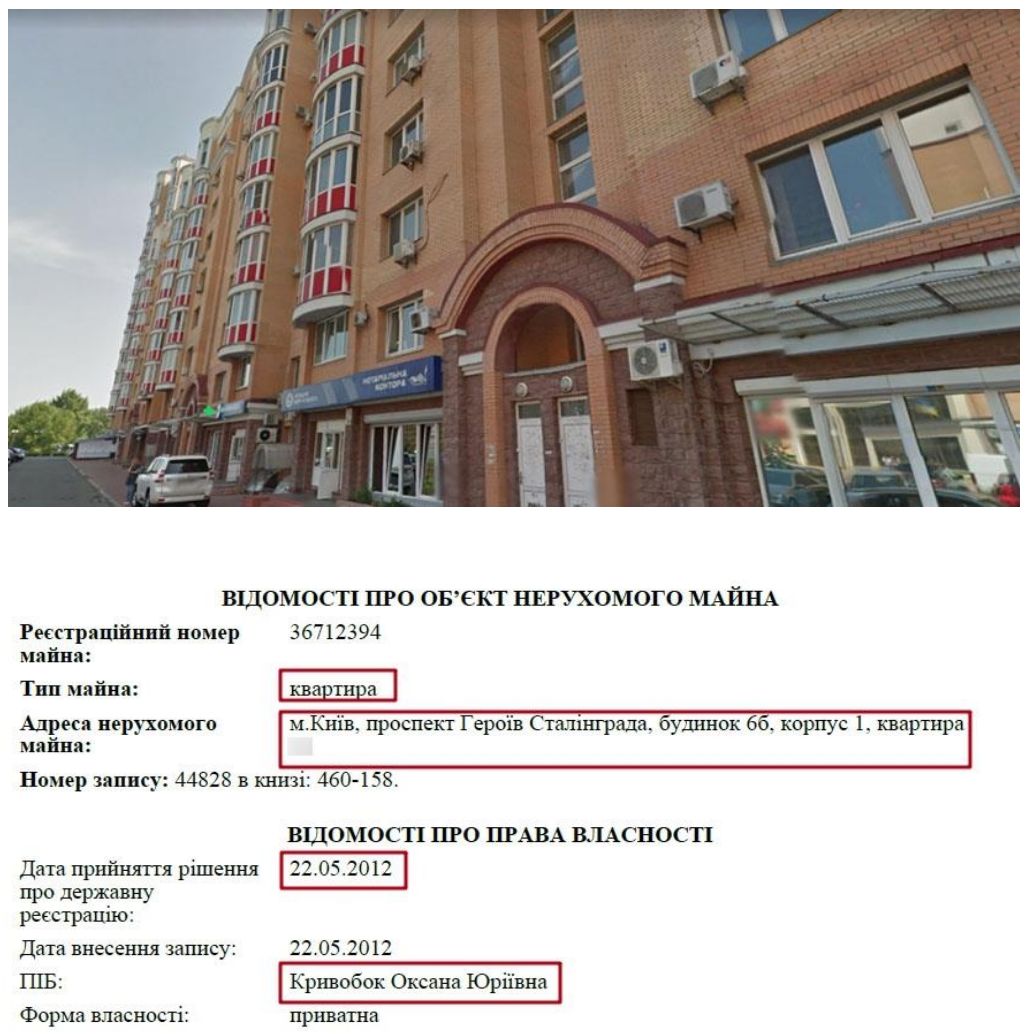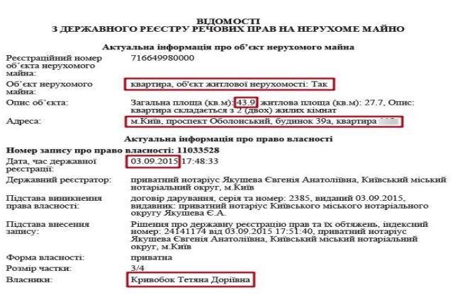 Жена прокурора тоже обзавелась жильем на Оболони. Она владеет квартирой площадью 43,9 м² по адресу проспект Оболонский, дом 39а. Приобрела данную квартиру Татьяна в 2015 году за 627 990 грн.