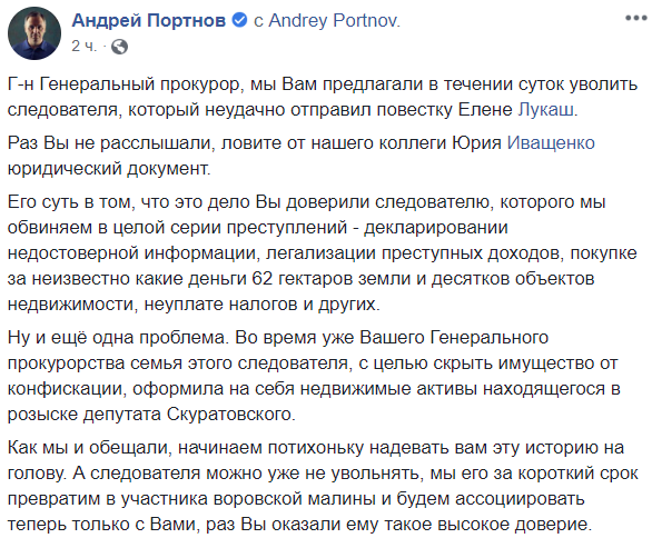 Как мы и обещали, начинаем потихоньку надевать вам эту историю на голову. А следователя можно уже не увольнять, мы его за короткий срок превратим в участника воровской малины и будем ассоциировать теперь только с Вами, раз Вы оказали ему такое высокое доверие", - написал Портнов в Facebook.