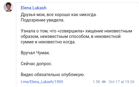"Друзья мои, все хорошо как никогда. Подозрение увидела. Узнала о том, что "совершила" хищение неизвестным образом, неизвестным способом, в неизвестной сумме и неизвестно когда. Вручал Чумак. Сейчас допрос. Видео обязательно опубликую".