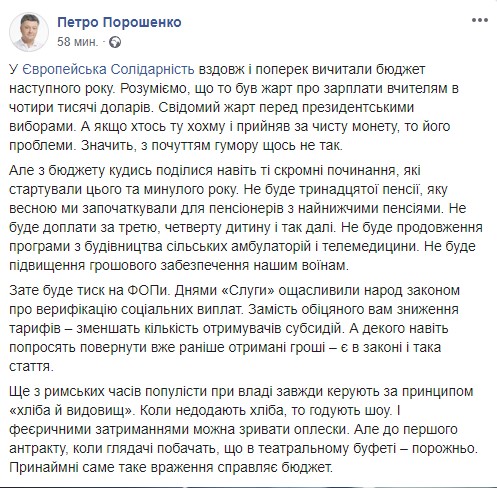 "Еще с римских времен популисты у власти всегда управляют по правилу "хлеба и зрелищ". Когда недодают хлеба, то кормят шоу. Феерическими задержаниями можно срывать аплодисменты. Но к первому антракту, зрители увидят, что в театральном буфете - пусто", - написал Порошенко, намекая на бюджет-2020, который 18 октября парламент поддержал в первом чтении.