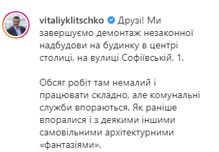 "Друзья! Мы завершаем демонтаж незаконной надстройки на доме в центре столицы, на улице Софиевской, 1. Объем работ там немалый и работать сложно, но коммунальные службы справятся. Как ранее справились и с некоторыми другими самовольными архитектурными "фантазиями", - написал градоначальник.