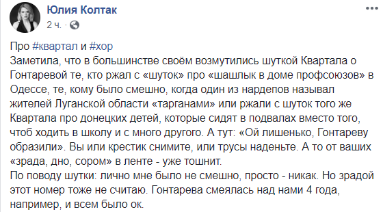 "Заметила, что в большинстве своём возмутились шуткой Квартала о Гонтаревой те, кто ржал с "шуток" про "шашлык в доме профсоюзов" в Одессе, те, кому было смешно, когда один из нардепов называл жителей Луганской области "тарганами" или ржали с шуток того же Квартала про донецких детей, которые сидят в подвалах вместо того, чтоб ходить в школу и с много другого. А тут: "Ой лишенько, Гонтареву образили". Вы или крестик снимите, или трусы наденьте. А то от ваших "зрада, дно, сором" в ленте - уже тошнит.