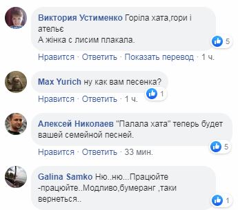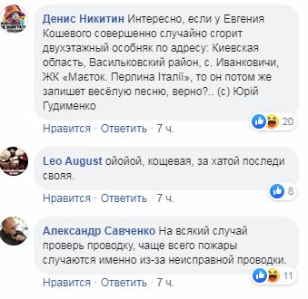 Пользователи, например, пишут: Денис Никитин: "Интересно, если у Евгения Кошевого совершенно случайно сгорит двухэтажный особняк по адресу: Киевская область, Васильковский район, с. Иванковичи, ЖК "Маєток. Перлина Італії", то он потом же запишет весёлую песню, верно?.. (с) Юрій Гудименко; Leo August: "Ойойой, кощевая, за хатой последи свояя", Александр Савченко: "На всякий случай проверь проводку, чаще всего пожары случаются именно из-за неисправной проводки"; Лилия Крыжанивска: "Ждите пожара...Это же так весело и смешно....хотя народ заслужил вас...таких вот постсовков без образования и морали...чудовища..." и т.д.