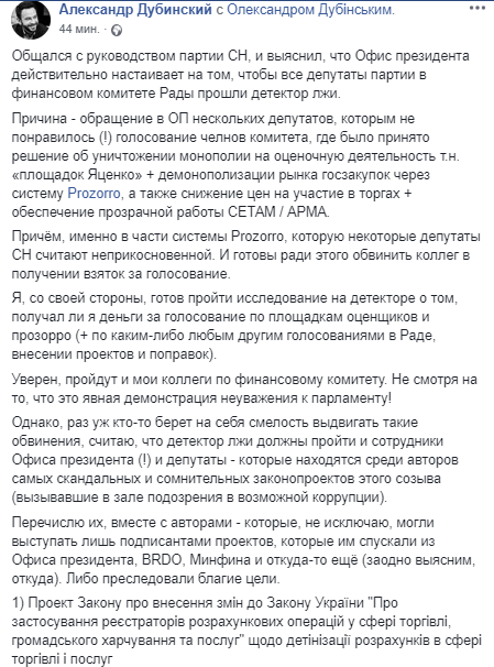 Офис президента настаивает на том, чтобы все депутаты партии "Слуга народа" в финансовом комитете Верховной Рады прошли детектор лжи. Об этом заявил нардеп от СН Александр Дубинский на своей странице в Facebook.