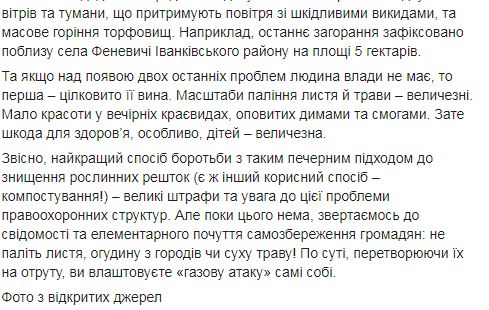 "К проблеме человеческой безответственности, безнаказанности и экологического невежества добавились еще две: погодные условия – антициклон с отсутствием ветров и туманов, который поддерживает воздух с вредными выбросами, и массовое горение торфяников. Например, последнее возгорание зафиксировано вблизи села Феневичи Иванковского района на площади 5 гектаров", - пишет заповедник.