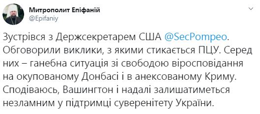 В своем Twitter Помпео заявил, что защита свободы вероисповедания для всех украинцев со стороны Епифания заслуживает похвалы. Также госсекретарь поздравил митрополита с получением награды "Athenagoras Human Rights Award".