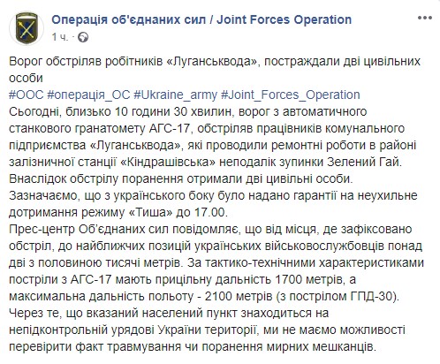 "Пресс-центр Объединенных сил сообщает, что от места, где зафиксирован обстрел, в ближайших позиций украинских военнослужащих более двух с половиной тысяч метров. По тактико-техническим характеристикам выстрела из АГС-17 имеют прицельную дальность 1700 метров, а максимальная дальность полета - 2100 метров (с выстрелом ГПД-30). Так как указанный населенный пункт находится на неподконтрольной правительству Украины территории, мы не имеем возможности проверить факт травмирования или ранения мирных жителей", - говорится в сообщении.