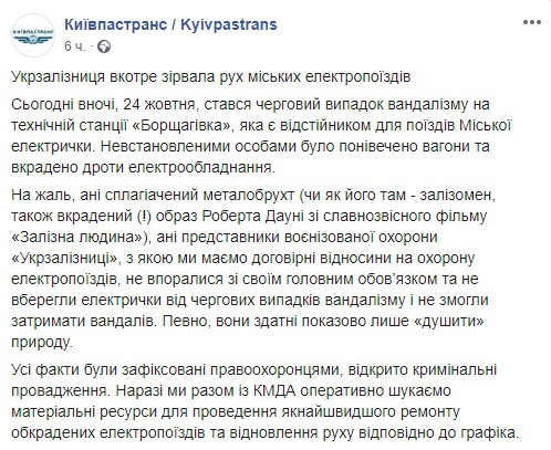 "К сожалению, ни сплагиаченный металлолом (или как его там – зализомен, также украденный образ Роберта Дауни из знаменитого фильма "Железный человек"), ни представители военизированной охраны "Укрзализныци", с которой мы имеем договорные отношения на охрану электропоездов, не справились со своей главной обязанностью и не уберегли электрички от очередных случаев вандализма и не смогли задержать вандалов. Вероятно, они способны показательно лишь "душить" природу", - говорится в сообщении "Киевпастранса" в Facebook.