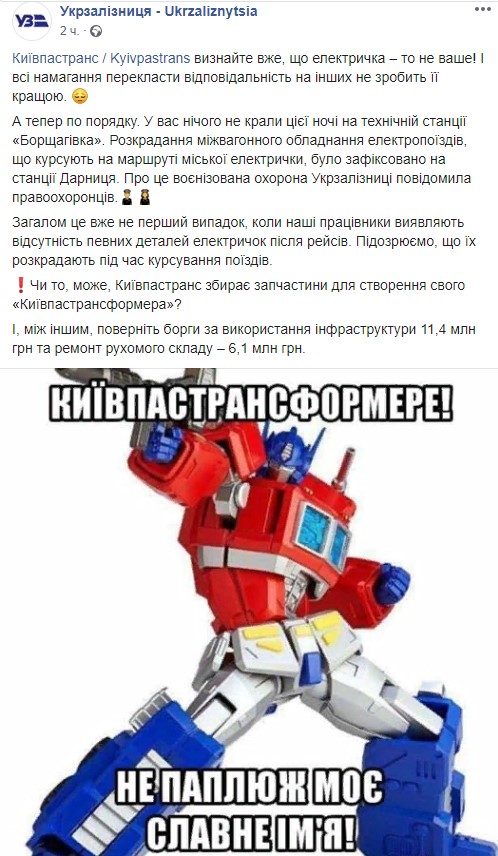 "Подозреваем, что их разворовывают во время курсирования поездов. Или, может, Киевпастранс собирает запчасти для создания своего "Киевпастрансформера"? И, между прочим, верните долги за использование инфраструктуры 11,4 миллиона гривен и ремонт подвижного состава – 6,1 миллиона гривен", - говорится в сообщении.