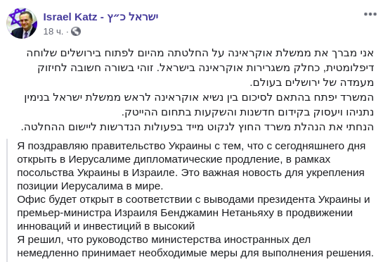 "Я поздравляю правительство Украины с открытием в Иерусалиме дипломатического продолжения в рамках Посольства Украины в Израиле. Это важная новость для укрепления позиции Иерусалима в мире", - подчеркнул Кац.