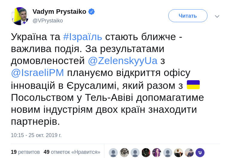 "Украина и Израиль становятся ближе - важное событие. По результатам договоренностей Владимира Зеленского с премьер-министром Израиля планируем открытие офиса инноваций в Иерусалиме, который вместе с   Посольством в Тель-Авиве будет помогать новым индустриям двух стран находить партнеров", - написал Пристайко.