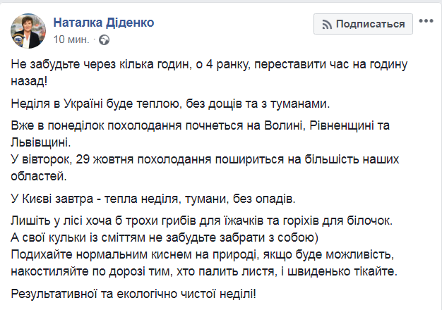 Воскресенье, 27 октября, обещает быть теплым и сухим, а вот с начала новой рабочей недели ожидается постепенное похолодание. Такой прогноз дала на своем Facebook синоптик Наталья Диденко.