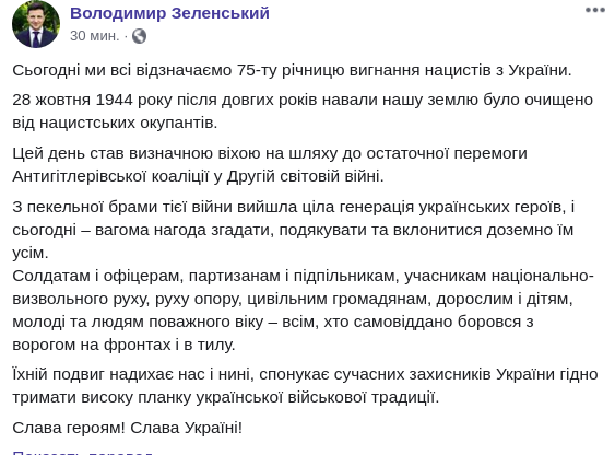 "Этот день стал выдающейся вехой на пути к окончательной победе антигитлеровской коалиции во Второй мировой войне. С адских ворот той войны вышла целая генерация украинских героев, и сегодня - весомая возможность вспомнить, поблагодарить и поклониться низко им всем.