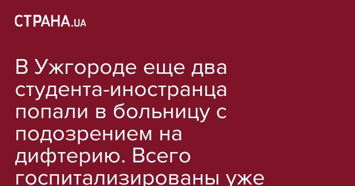 В Ужгороде госпитализировали еще двоих человек с подозрением на дифтерию. В областной клинической инфекционной больнице находятся 17 студентов-иностранцев Ужгородского национального университета, сообщается на сайте Ужгородского горсовета в понедельник, 28 октября.