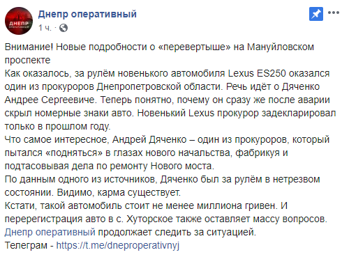 "Речь идет о Дяченко Андрее Сергеевиче. Теперь понятно, почему он сразу же после аварии скрыл номерные знаки авто. Новенький Lexus прокурор задекларировал только в прошлом году. Что самое интересное, Андрей Дяченко – один из прокуроров, который пытался "подняться" в глазах нового начальства, фабрикуя и подтасовывая дела по ремонту Нового моста. По данным одного из источников, Дяченко был за рулем в нетрезвом состоянии. Видимо, карма существует", - говорится в сообщении. Также уточняется, что такой автомобиль стоит не менее миллиона гривен.