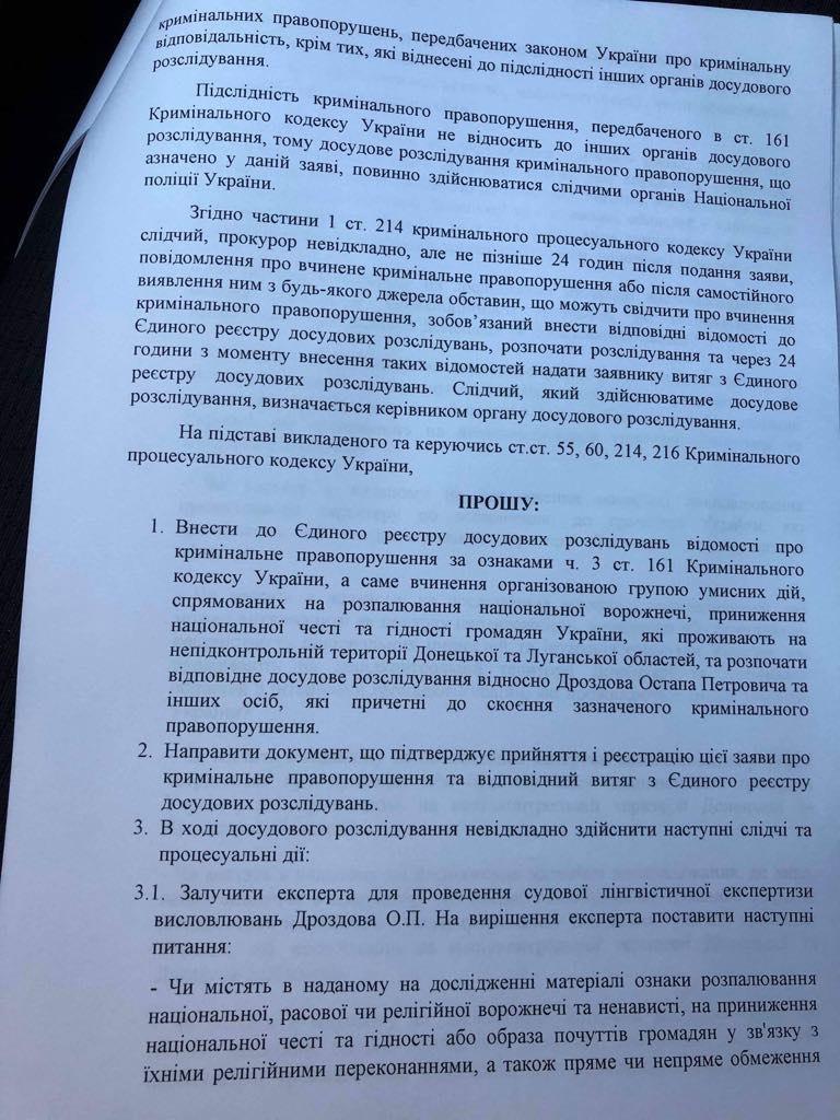"Итак, друзья, у нас уже есть зарегистрированное заявление против Остапа Дроздова за разжигание ненависти", - сообщила Олеся Медведева, показав само заявление.