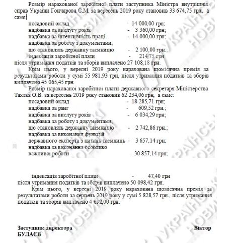 Согласно выписке Департамента коммуникаций МВД Украины, зарплата Сергея Ярового, первого зама Авакова, составила 83911 грн, заместителей Сергея Гончарова – 89655 грн, Татьяны Ковальчук – 89655 грн, Вадима Трояна – 14661 грн, государственного секретаря Алексея Тахтая – 68062 грн.