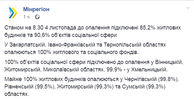 Министерство развития общин и территорий Украины обнародовало данные подключения отопления по состоянию на 08:30 4 ноября. Они опубликованы на странице ведомства в Facebook.