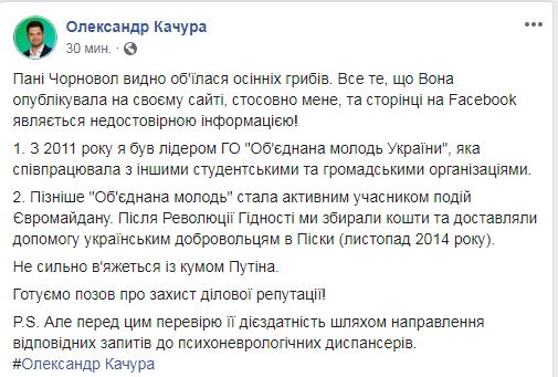 В свою очередь Качура ответил в Facebook, что "госпожа Черновол, видимо, объелась осенними грибами", а вся информация, опубликованная Черновол, является недостоверной.