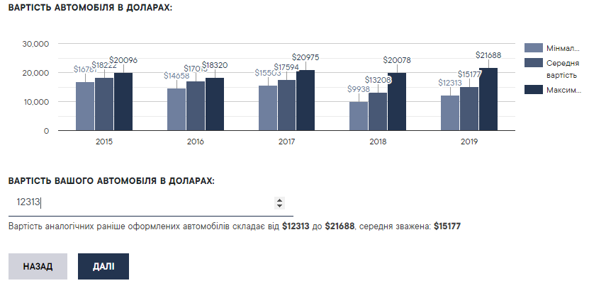Как видим, калькулятор сам задает оценку автомобиля  минимально 12 313 долларов (с учетом уровня цен на рынке, а не технических параметров авто).