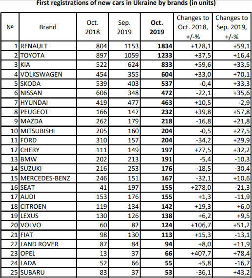 Статистика продаж автомобилей в Украине в октябре 2019 года Фото: ukrautoprom.com.ua