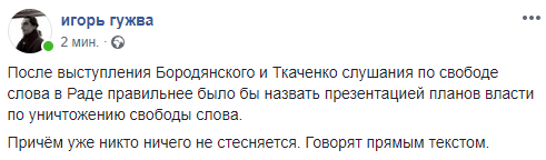 13:15 "После выступления Бородянского и Ткаченко слушания по свободе слова в Раде правильнее было бы назвать презентацией планов власти по уничтожению свободы слова. Причём уже никто ничего не стесняется. Говорят прямым текстом" - прокомментировал слушания главный редактор "Страны" Игорь Гужва.