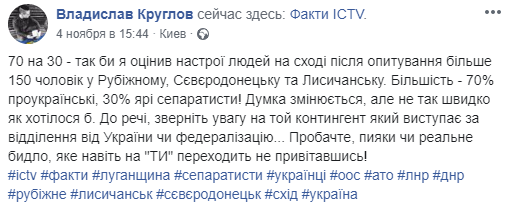 На канале ICTV вышел сюжет о том, "как украинцы на востоке изменили отношение к войне". В нем сообщалось, что корреспондент канала Владислав Круглов опросил 150 человек. Один из опрошенных эмоционально рассказал, что до появления "заукраинцев" была тишина и покой".