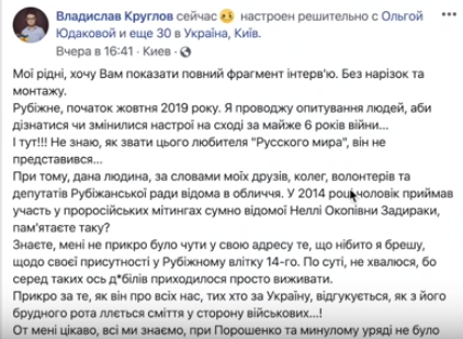 "Мои родные, хочу вам показать полный фрагмент интервью. Без нарезок и монтажа. Рубежное. Начало октября 2019 года. Я провожу опрос людей, чтобы узнать, изменились ли настроения на востоке за почти 6 лет войны... И тут!!! Не знаю, как зовут этого любителя "Русского мира", он не представился" - посвятил ему пост журналист. Он добавил, что его знакомые рассказали, что этот мужчина принимал участие в пророссийских митингах в 2014 году.