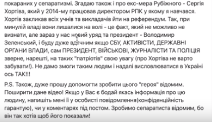 Он добавил, что при Порошенко не было наказанных за сепаратизм. И что будет благодарен. если на таких "патриотов" обратит внимание СБУ, активисты, органы госвласти, сам президент. военные, журналисты и полиция.
