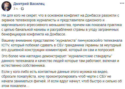 Журналист Дмитрий Василец написал, что "журналист" ICTV побежал сдавать в СБУ гражданина Украины за неугодный его душевной конструкции комментарий, который он сам и попросил".