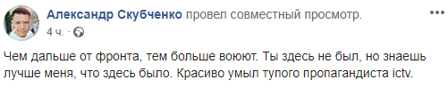 "Чем дальше от фронта, тем больше воюют. Ты здесь не был, но знаешь лучше меня, что здесь было. Красиво умыл тупого пропагандиста ictv" - написал глава Жилищного союза Украины Александр Скубченко.