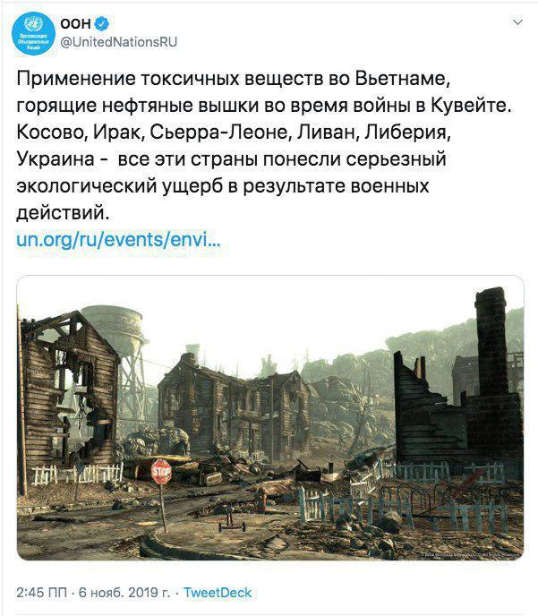 Российская служба Организации Объединенных Наций в своем Twitter рассказала об ущербе экологии из-за военных конфликтов по всему миру. К тексту они добавили скриншот из постапокалиптической игры Fallout 3. Однако вскоре они поменяли картинку на другую.