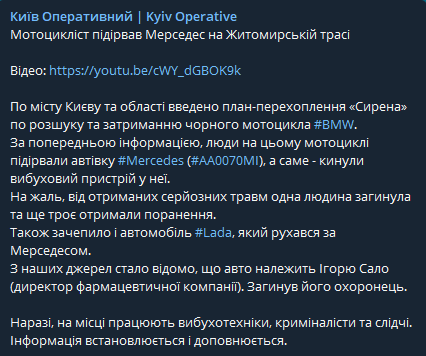 Взрыв на Житомирской трассе. Подорвано авто директора фармацевтической компании Игоря Сало - СМИ
