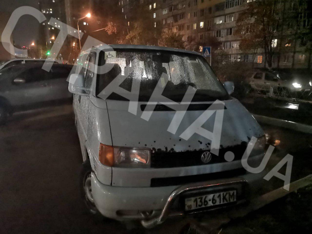 Жители дома рассказали, что недавно у автомобиля Алексея кто-то ночью пробил колесо. И действительно, левое заднее колесо на машине оказалось спущено. Машину "святошинского стрелка" узнать легко: это белый "бусик" со значком "инвалид".