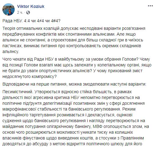 "Совет НБУ. 4: 4 или 4 ≠ 4 или 4 №4? Теория оптимальных коалиций допускает неожиданные варианты решения предполагаемых конфликтов между спонтанными альянсами. Но если альянсы не спонтанны, а спроектированы для более сложной игры в чьих-то пасьянсах, возникает вопрос о контролируемости отдельных составляющих альянса", – написал в Facebook в четверг вечером член совета Виктор Козюк.