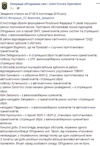 Напомним, что за прошедшие сутки, 8 ноября, боевики ОРДЛО открывали огонь по украинцам 11 раз, в результате чего один боец ВСУ получил ранения. Еще один скончался в больнице.