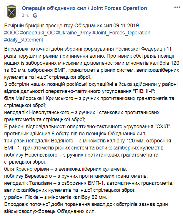 В течение последних суток вооруженные формирования противника 11 раз нарушили режим прекращения огня. Об этом на вечернем брифинге заявили представители пресс-центра Операции объединенных сил (ООС).