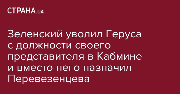 Президент Украины Владимир Зеленский уволил Андрея Геруса с должности представителя президента в Кабинете министров, а на его место назначил Алексея Перевезенцева. Соответствующие указы №838/2019 и №839/2019 появились на сайте главы государства.