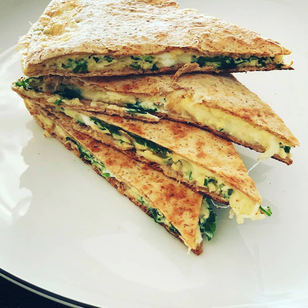 Итак, вот рецепт "Омлета в лаваше": "Два яйца взбить вилкой, добавить зелень (можно абсолютно любую). На раскаленную сковороду без масла положить один лист цельнозернового лаваша (или обычного), вылить смесь яиц и зелени, посыпать моцареллой (или любым другим сыром), накрыть вторым листом лаваша. Закрыть крышкой. Выпекать по несколько минут с каждой стороны на медленном огне".