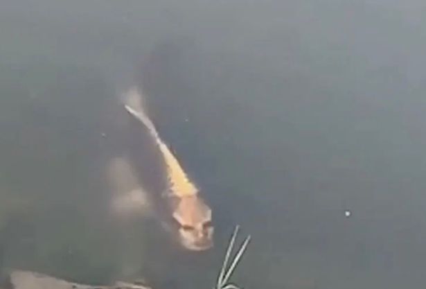 В ролике видно, как рыба (предположительно, карп кои, он же парчовый карп) неторопливо подплывает к берегу и высовывает морду из воды.