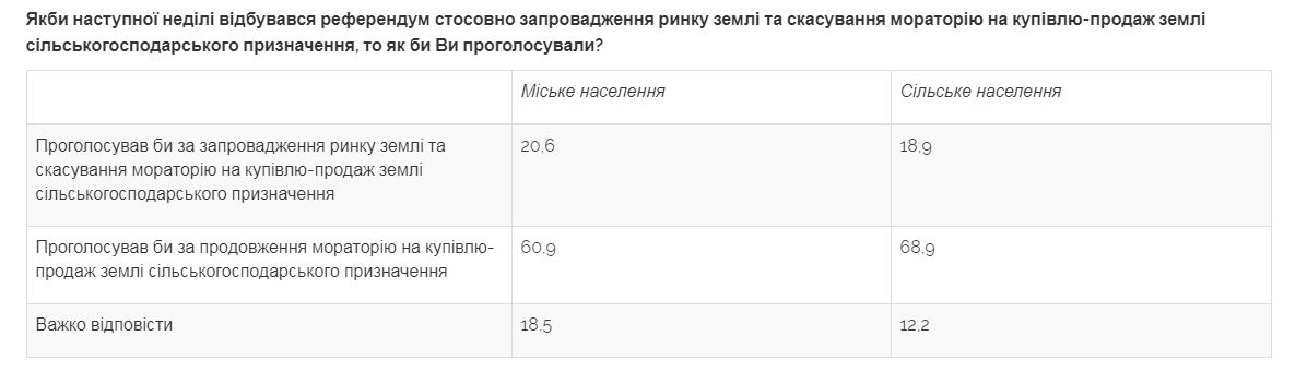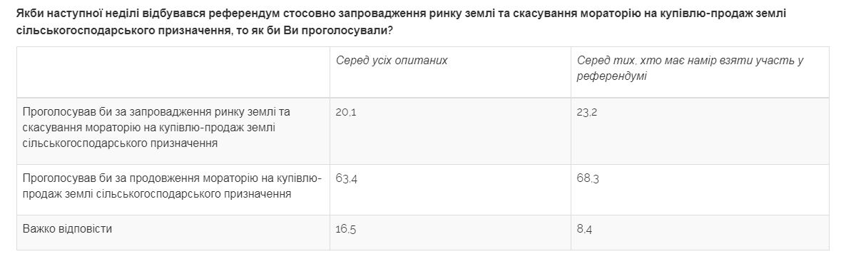 Большинство украинцев считает, что вопрос введения рынка земли и отмены моратория на куплю-продажу земли сельскохозяйственного назначения нужно выносить на всенародный референдум. Такого мнения придерживаются 67,7% респондентов, 20,5% опрошенных считают, что этот вопрос не следует выносить на референдум, остальные не определились с ответом.