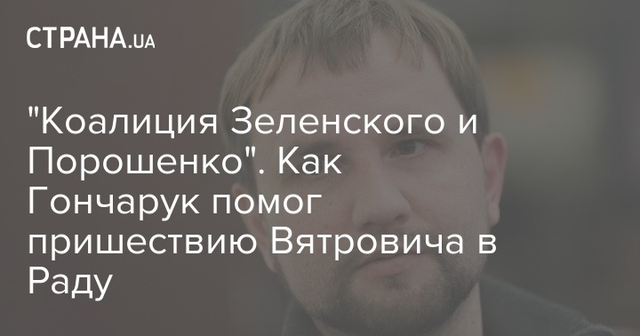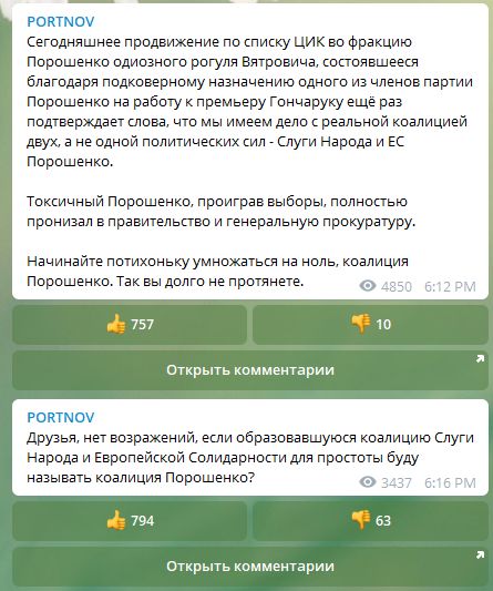 "Сегодняшнее продвижение по списку ЦИК во фракцию Порошенко одиозного рогуля Вятровича, состоявшееся благодаря подковерному назначению одного из членов партии Порошенко на работу к премьеру Гончаруку ещё раз подтверждает слова, что мы имеем дело с реальной коалицией двух, а не одной политических сил - Слуги Народа и ЕС Порошенко.