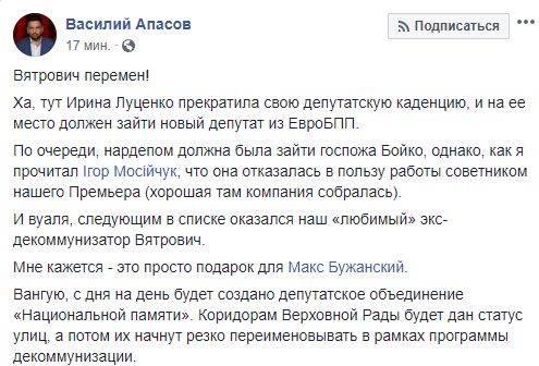 Экс-депутат Игорь Мосийчук пишет о том же: "Следите за руками! Але-оп и Владимир Вятрович - народный депутат!