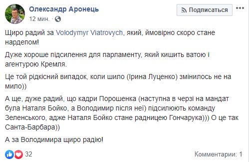 Свободовец Александр Аронец заявил, что пришествие Вятровича - это хорошо, но тоже отметил, что кадры Порошенко усиливают команду Зеленского: "Искренне рад за Volodymyr Viatrovych, который, вероятно скоро станет нардепом! Очень хорошее усиление для парламента, который кишит ватой и агентурой Кремля. Это тот редкий случай, когда шило (Ирина Луценко) изменилось не на мыло))
