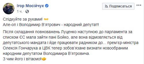 После сложения полномочий Луценко следующей в парламент по спискам ЕС должна зайти госпожа Бойко, но она отказывается от депутатского мандата и идет работать советником у ... премьер-министра Алексея Гончарука, а ЦИК теперь обязана признать новоизбранным народным депутатом Владимира Вятровича. С чем его и поздравляем!"