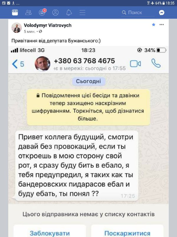 Началось с того, что Вятрович выложил скрин якобы сообщения, которое получил от Бужанского. Оно переполнено угроз в адрес будущего нардепа от БПП.